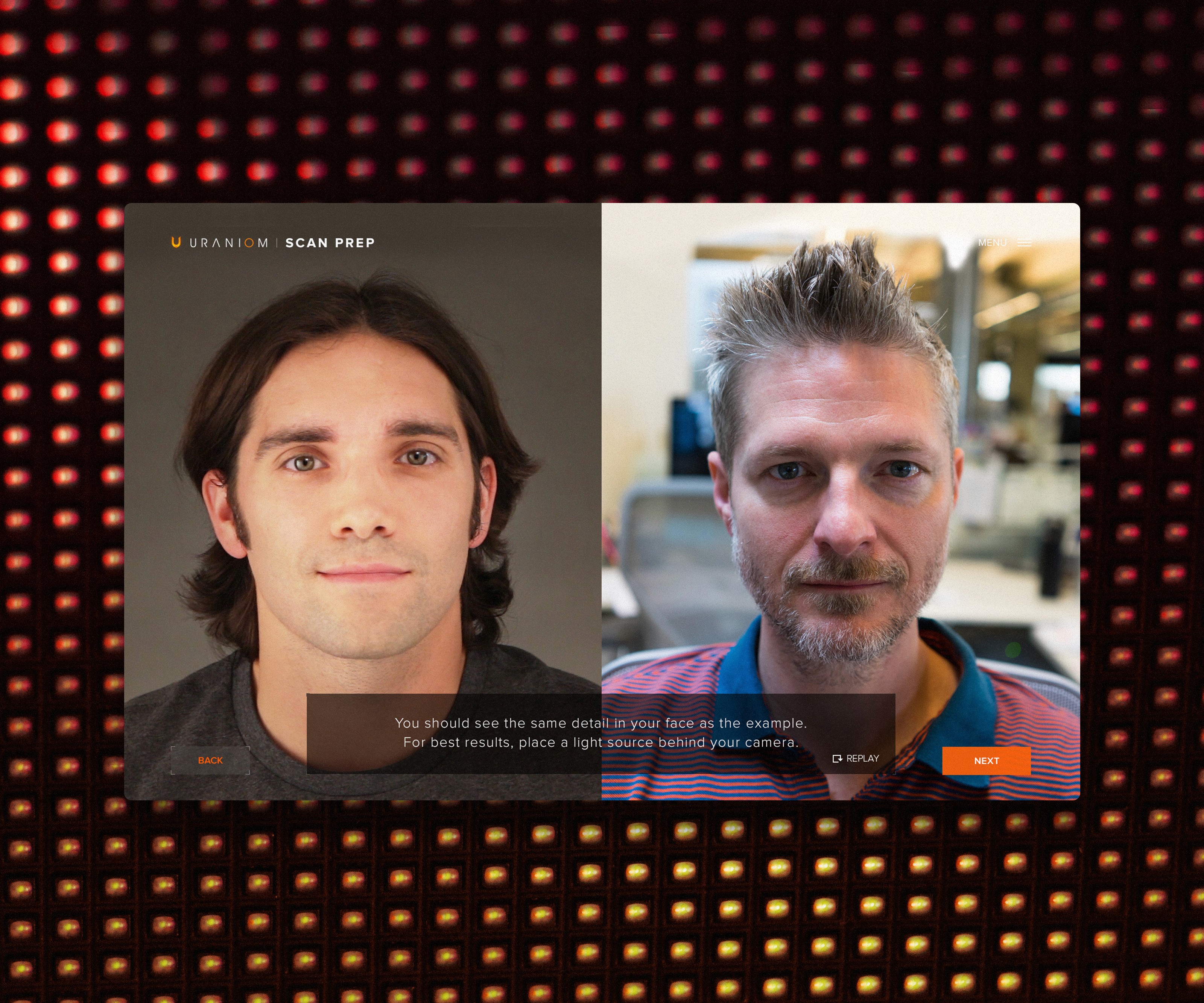 A tutorial was provided to the user with a side by side view to allow comparisons for ideal lighting, and to remove any obstructions near the face.