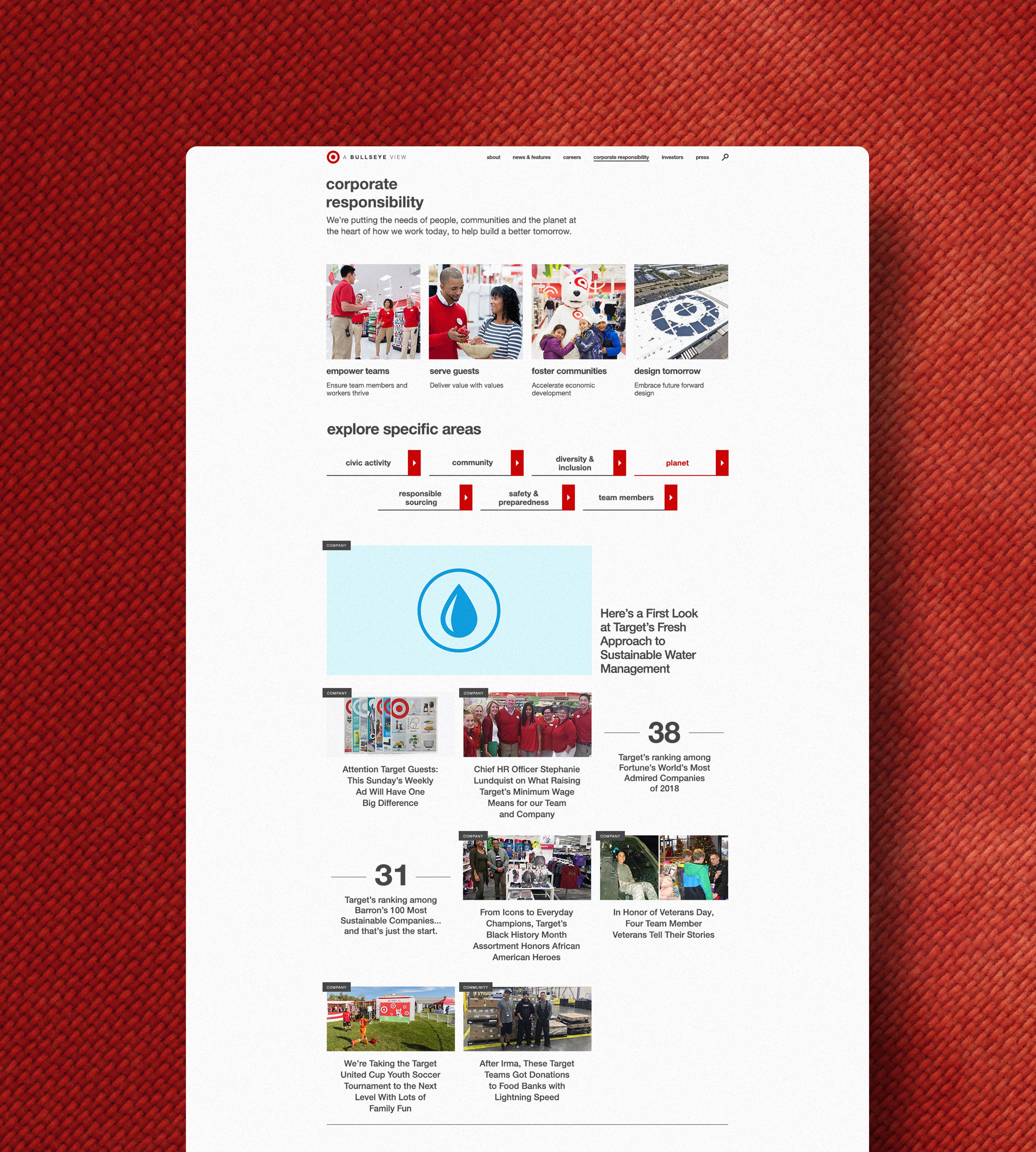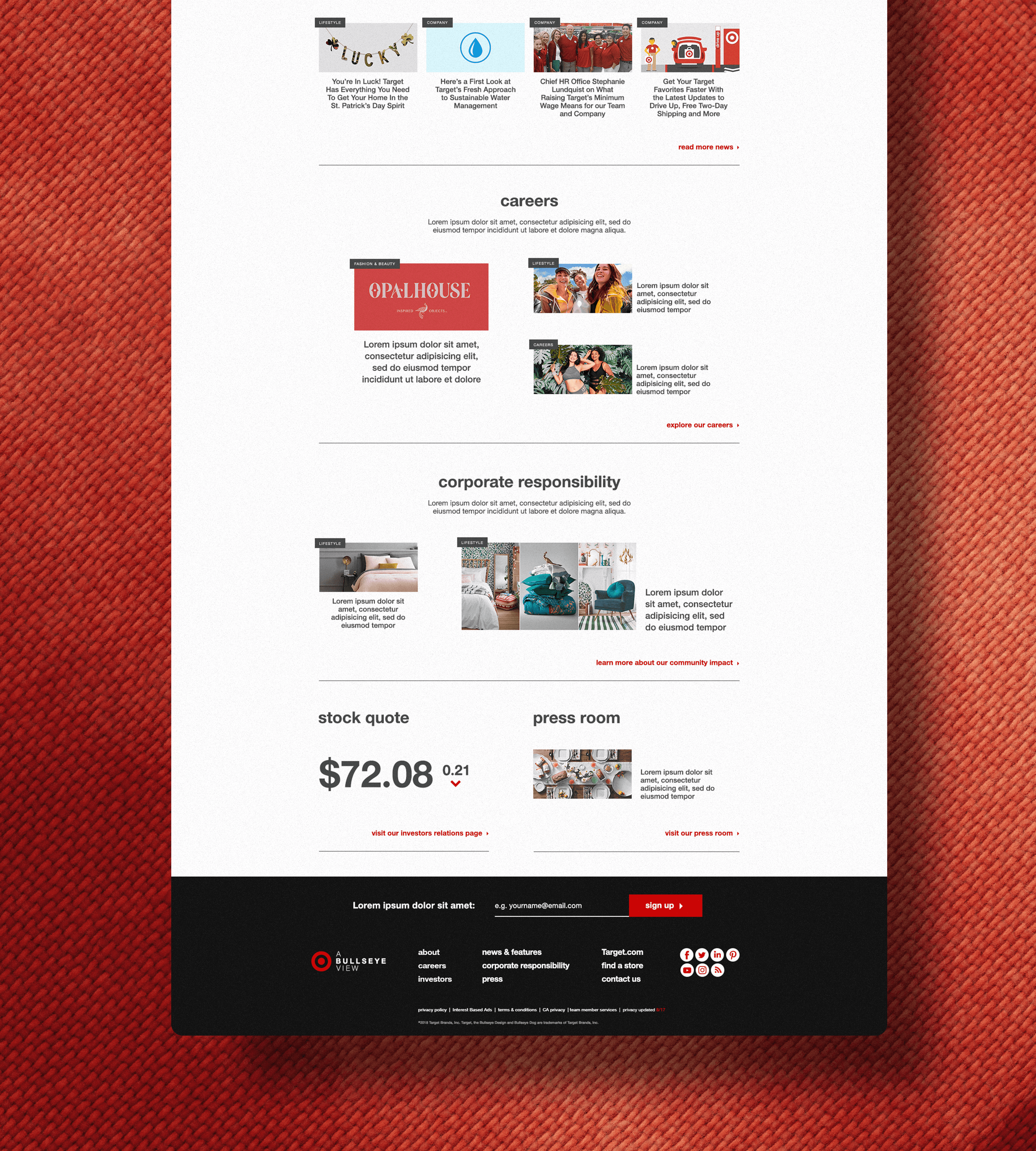 Tasked with reimaging the Target "A Bullseye View" corporate homepage to better highlight the high-value editorial work they were interested in highlighting balanced with the breadth of corporate information already present, the project grew to a redesign of the corporate site align with Target's rich modernist design history. The key to the redesign was a thoughtful and cost-saving approach that was entirely built off of the pre-existing architecture with just adjustments to the underlying components.