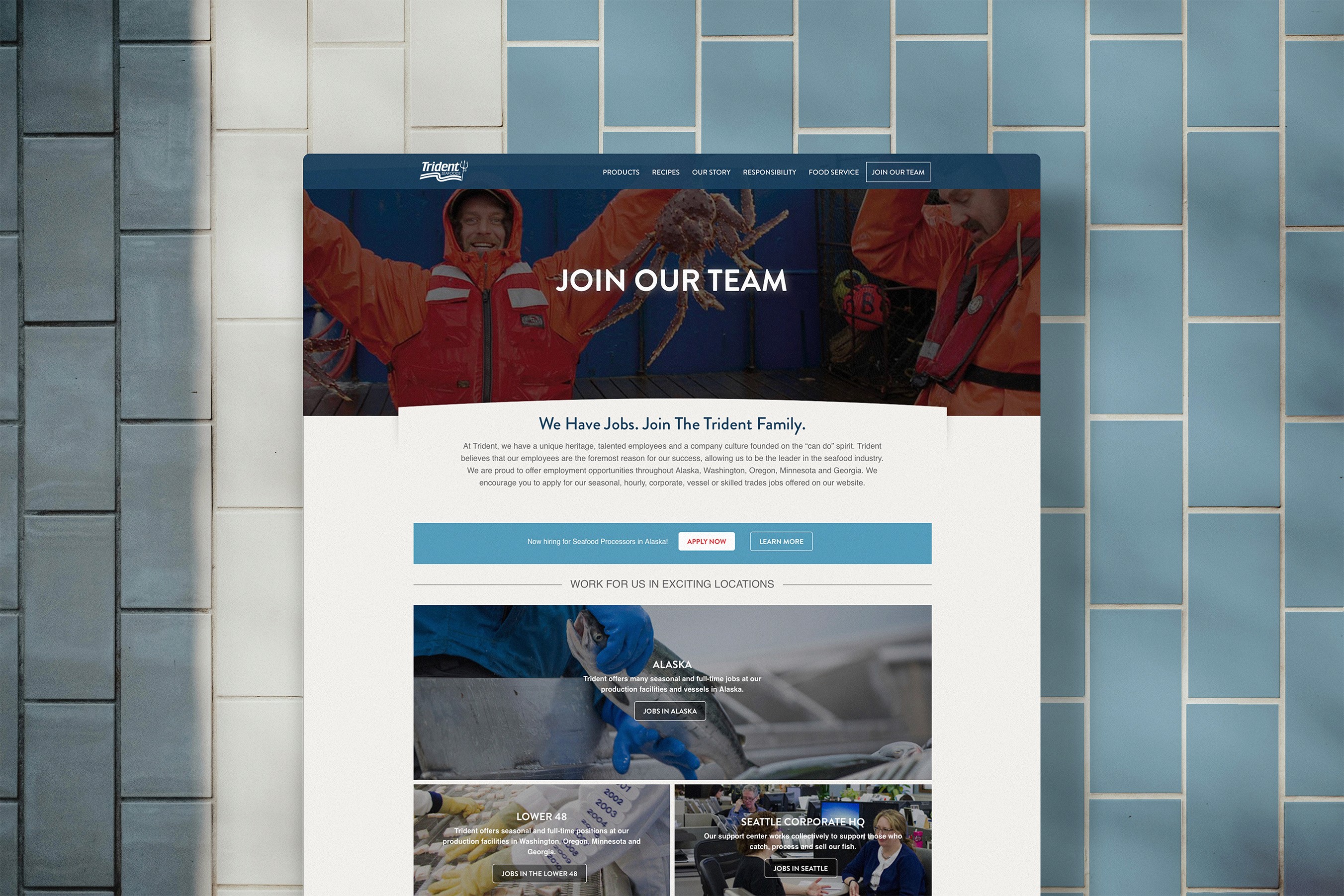 Less seen by typical consumers of Trident products was the Jobs section of the website that rounded out my areas of focus on the website. The Jobs section is incredibly important as Trident fills thousands of jobs in Alaska every year and is constantly looking for new employees to work in their production facilities. The webpage needed to be easy to scan, with quick access to see the open jobs available at their Alaska plants, while not leaving out their corporate office jobs that target a dramatically smaller group of applicants.